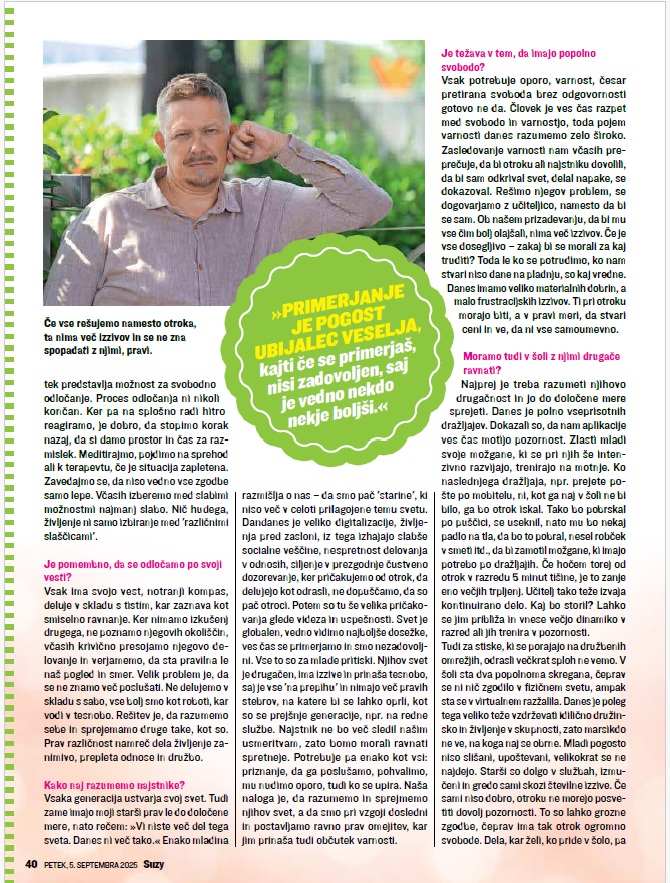 Intervju V otroku je treba razplamtevati tisto, kar ga zanima je bil objavljen v reviji Suzy (Slovenske novice), 19. 9. 2025. Avtorica: Mateja Blažič Zemljič, fotografija: Dejan Javornik.